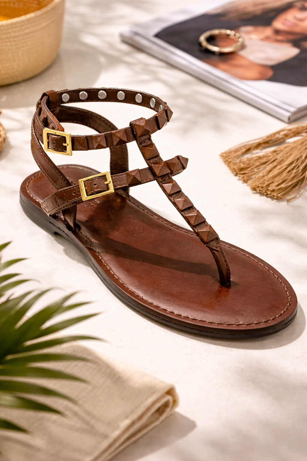 A sandália feminina rasteira marrom é a escolha perfeita para quem busca estilo, conforto e versatilidade no dia a dia. Com design moderno e detalhes em tachas, o modelo traz um toque de atitude e sofisticação para qualquer produção.